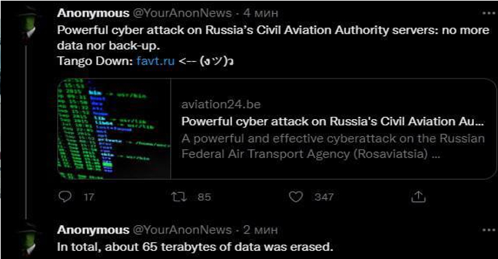 A cyberattack on the Russian Federal Air Transport Agency's (Rosaviatsia) infrastructure allegedly erased all documents, files, aircraft registration data and emails from the servers. The agency lost nearly 65 terabytes of data.